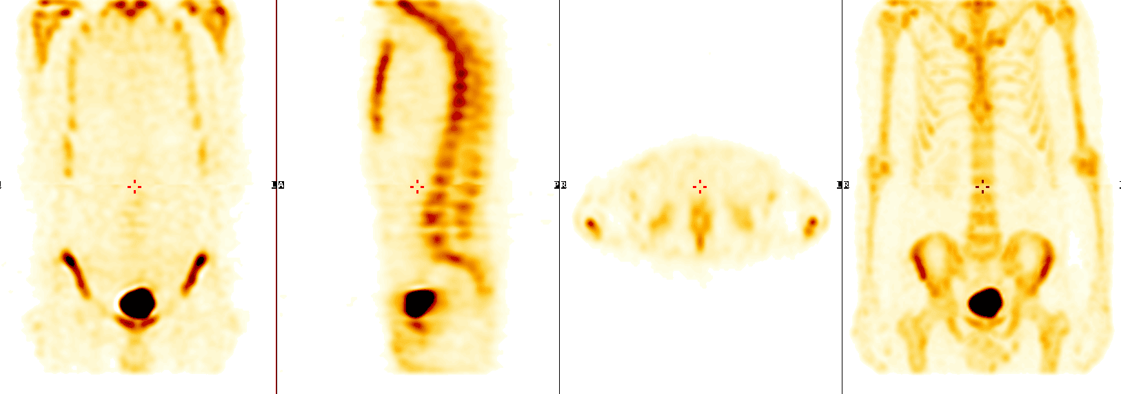 - Superscan – difuzní symetrické vychytávání v celém skeletu bez renální exkrece (např. difuzní metastázy, těžké metabolické poruchy).