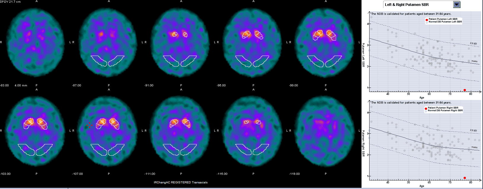 Snížení vazby 123I-ioflupanu ve striatu je tedy nepřímým ukazatelem neurodegenerace nigrostriatální dráhy, typické pro Parkinsonovu nemoc (PN) a další parkinsonské syndromy.