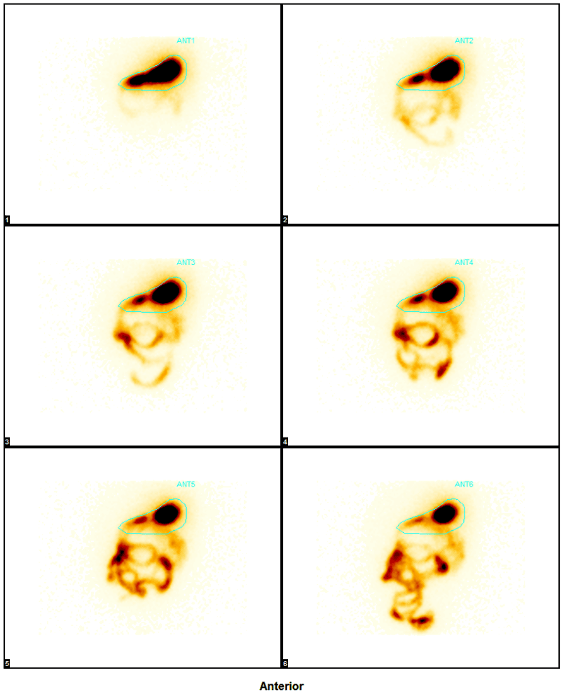 - Patologické zpomalení: retence >60 % po 2 hodinách, resp. >10 % po 4 hodinách.